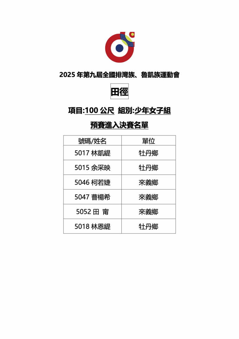 🎉🎉🎉狂賀!排球-壯年男子組(九人制)第一名:瑪家鄉(高文慶、何義勝、葉哲明、邱志文、蔡天明、蔣書懷、簡志強、方正榮、曾永安、林中逵、黃進雄、董志豪、黃彥俊、黃輝雄、郭明義)🎉🎉🎉狂賀!排球-公開男子組(六人制)第一名:瑪家鄉(董聖文、武睿恩、蔡東橙、林翰杰、謝宇杰、何皓維、李駿、施予恩、羅予宸、柳育晨、翁昱誠)🎉🎉🎉狂賀!籃球-公開男子組第一名:牡丹鄉(黃英凱、陳京華、潘念龍、宋富傑、尤承恩、張仲崴、林澔恩、周祐民、洪孝麒、許皓哲、潘昱璋、許昊評、洪懷恩、潘冠綸、黃少玄)🎉🎉🎉狂賀!籃球-壯年男子組第一名:牡丹鄉(白慶漢、林志偉、林克偉、謝志鴻、鄧凱君、潘宣任、林呈賢、陳韋麟、姚弘德、郭博駿、戚光復、陳政文、古啟為、董尚德、陳豪杰)🎉🎉🎉狂賀!排球-公開女子組(六人制)第一名:三地門鄉(高勒斯、柯念慈、古撒楂.思樂、吳瑜潔、王海燕、高恩慈、許瑜落、柯育婷、江思萳、何亮妤、宋湘薰、顏祈蓁)🎉🎉🎉狂賀!田徑-公開混合組【20x100 公尺大隊接力】第一名:牡丹鄉(潘以樂、歐奕廷、高立、杜俊毅、李樂、高晨耀、方致亮、郭大千、林佑杰、何以諾、董薇安、陳詩涵、余欣蕾、王緹、蔡方瑜、余涵、黃凌兒、蔡妤芯、杜禹瑩、鍾晨葳)🎉🎉🎉狂賀!足球(五人制)-少年女子組第一名:來義鄉(卓苡安、高姷安、劉馨妤、呂艾蓁、蘇利莎、高培欣、宗貝樺、王培瑄、林莫、高曉安、蘇艾莎、曹亞柏蘭)🎉🎉🎉狂賀!足球(五人制)-青少年女子組第一名:泰武鄉(田芷嫣、張歆瑜、陳琳、王羽涵、鍾愛、拉法屋斯.道卡都、孫妍晞、邱亮瑜、王喜善、謝巧恩、董暮婗、謝潔恩)🎉🎉🎉狂賀!足球(五人制)-青少年男子組第一名:牡丹鄉(陳杰瑞、潘政杰、陳聖楷、張維丞、謝雨翔、張辰軍、潘元澤、林 肯、高浩安、王胤、胡宇諾、白玉安)🎉🎉🎉狂賀!足球(五人制)-公開男子組第一名:春日鄉(黃杰、洪子貴、李祥偉、黃世恩、林陞、林晨、陳亞靖、林韋揚、陳家祥、蔡振偉、廖雨豪、潘宗皓)🎉🎉🎉狂賀!慢速壘球-公開男子組第一名:牡丹鄉(林承御、李冠年、馬許晧、尤士豪、潘華銨、張皓偉、張皓晨、林識賢、李智揚、陳泰羽、余廣嶺、童緯、古培脩、鐘聖傑、吳家銘、林奕廷、李紹宗、賴志成、黃岑浩、柯毅)🎉🎉🎉狂賀!傳統射箭-公開男女混雙對抗賽第一名:春日鄉(郭美心、呂天明)🎉🎉🎉狂賀!傳統拔河-公開混合組第一名:三地門鄉(鄭孝恆、郭文榮、雷建斌、鄭家豪、楊正豪、何浩銘、捌賽·達里馬烙·捌茲格勒、馮偉成、黃孝祖、蔡世豪、鄭孝榮、楊翔皓、黃孝宗、楊揚、田筱柔、涂陳眞、蔡芳妤、江以璇、董俐伶、全田以法、䝉偉杉、柯祖筠、杜以斯帖、馮玉安)🎉🎉🎉狂賀!羽球-壯年男子雙打第一名:瑪家鄉(洪仁光、簡孝勇)🎉🎉🎉狂賀!足球(五人制)-公開女子組第一名:牡丹鄉(黃鈺婷、黃玉慈、張君涵、鐘欣凌、張舒凱、謝嘉欣、柯璇、謝嘉禎、余亞凡、許師郁、黃宜君)🎉🎉🎉狂賀!田徑-公開男子組【4x400公尺接力】第一名:三地門鄉(明太尊、黃柏豪、邱孝嚴、詹堂貴)🎉🎉🎉狂賀!羽球-長青女子雙打第一名:來義鄉(高淑珍、余英玲)🎉🎉🎉狂賀!田徑-公開女子組【4x400公尺接力】第一名:牡丹鄉(余涵、劉萱、余欣蕾、董薇安)🎉🎉🎉狂賀!傳統射箭-公開男子組【團體對抗賽】第一名:金峰鄉(温少軒、蔡新德、陳璽旨、陳信有)🎉🎉🎉狂賀!傳統射箭-公開女子組【團體對抗賽】第一名:大武鄉(潘如慧、王妤若、潘如萍、谷阿娜 答給帆)🎉🎉🎉狂賀!田徑-公開男子組【三級跳遠】第一名:牡丹鄉(葉吳堉綋)🎉🎉🎉狂賀!足球(五人制)-少年男子組第一名:來義鄉(高丰、魏雋喆、柯柏文、卓尚恩、連霓昊、王維希、魏亮喆、羅允希、陳品叡、孔霆威)🎉🎉🎉狂賀!羽球-長青男子雙打第一名:牡丹鄉(蔡志光、蔡品清)🎉🎉🎉狂賀!桌球-公開團體組第一名:三地門鄉(李慶男、巴士明、陳明光、陳佳佑、陳彌、黃羽彤、黃韞纈、陳佳旋、邱秀妹、江恩羽)🎉🎉🎉狂賀!籃球-公開女子組第一名:牡丹鄉(周思華、劉赫媞、葉吳佳君、華韋恩、張卉卿、張卉庭、李恩屏、張佳茵、李安琪、陳子柔、張辰妍、潘芊芷、簡宇婕、莊婕心、葉吳佳佳)🎉🎉🎉狂賀!田徑-少年女子組【4x200公尺接力】第一名:來義鄉(洪敏恩、柯若婕、田甯、曹楊希)🎉🎉🎉狂賀!傳統射箭-公開女子組【個人對抗賽】第一名:大武鄉(谷阿娜.答給帆)🎉🎉🎉狂賀!羽球-壯年女子雙打第一名:霧臺鄉(鄭佳音、馮玉蘭)🎉🎉🎉狂賀!田徑-公開女子組【跳遠】第一名:達仁鄉(劉朔媛)🎉🎉🎉狂賀!田徑-少年男子組【4x200公尺接力】第一名:三地門鄉(鄭瑾謄、楊大慶、柯偉翔、馮敏傑)🎉🎉🎉狂賀!負重接力-公開混合組第一名:三地門鄉(翁俊洋、邱孝嚴、黃柏豪、明太尊、李柔、陳念家、邱孝諼、潘欣、潘念祖、江思萳)🎉🎉🎉狂賀!田徑-公開男子組【800公尺】第一名:瑪家鄉(簡廷翰)🎉🎉🎉狂賀!田徑-公開女子組【800公尺】第一名:來義鄉(湯婕妤)🎉🎉🎉狂賀!傳統射箭-公開男子組【個人對抗賽】第一名:卑南鄉(李漢儐)🎉🎉🎉狂賀!桌球-公開組女子雙打賽第一名:三地門鄉(黃韞纈、黃羽彤)🎉🎉🎉狂賀!桌球-公開組男子雙打賽第一名:三地門鄉(陳佳佑、陳彌)🎉🎉🎉狂賀!