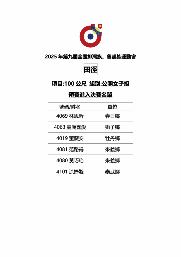 🎉🎉🎉狂賀!排球-壯年男子組(九人制)第一名:瑪家鄉(高文慶、何義勝、葉哲明、邱志文、蔡天明、蔣書懷、簡志強、方正榮、曾永安、林中逵、黃進雄、董志豪、黃彥俊、黃輝雄、郭明義)🎉🎉🎉狂賀!排球-公開男子組(六人制)第一名:瑪家鄉(董聖文、武睿恩、蔡東橙、林翰杰、謝宇杰、何皓維、李駿、施予恩、羅予宸、柳育晨、翁昱誠)🎉🎉🎉狂賀!籃球-公開男子組第一名:牡丹鄉(黃英凱、陳京華、潘念龍、宋富傑、尤承恩、張仲崴、林澔恩、周祐民、洪孝麒、許皓哲、潘昱璋、許昊評、洪懷恩、潘冠綸、黃少玄)🎉🎉🎉狂賀!籃球-壯年男子組第一名:牡丹鄉(白慶漢、林志偉、林克偉、謝志鴻、鄧凱君、潘宣任、林呈賢、陳韋麟、姚弘德、郭博駿、戚光復、陳政文、古啟為、董尚德、陳豪杰)🎉🎉🎉狂賀!排球-公開女子組(六人制)第一名:三地門鄉(高勒斯、柯念慈、古撒楂.思樂、吳瑜潔、王海燕、高恩慈、許瑜落、柯育婷、江思萳、何亮妤、宋湘薰、顏祈蓁)🎉🎉🎉狂賀!田徑-公開混合組【20x100 公尺大隊接力】第一名:牡丹鄉(潘以樂、歐奕廷、高立、杜俊毅、李樂、高晨耀、方致亮、郭大千、林佑杰、何以諾、董薇安、陳詩涵、余欣蕾、王緹、蔡方瑜、余涵、黃凌兒、蔡妤芯、杜禹瑩、鍾晨葳)🎉🎉🎉狂賀!足球(五人制)-少年女子組第一名:來義鄉(卓苡安、高姷安、劉馨妤、呂艾蓁、蘇利莎、高培欣、宗貝樺、王培瑄、林莫、高曉安、蘇艾莎、曹亞柏蘭)🎉🎉🎉狂賀!足球(五人制)-青少年女子組第一名:泰武鄉(田芷嫣、張歆瑜、陳琳、王羽涵、鍾愛、拉法屋斯.道卡都、孫妍晞、邱亮瑜、王喜善、謝巧恩、董暮婗、謝潔恩)🎉🎉🎉狂賀!足球(五人制)-青少年男子組第一名:牡丹鄉(陳杰瑞、潘政杰、陳聖楷、張維丞、謝雨翔、張辰軍、潘元澤、林 肯、高浩安、王胤、胡宇諾、白玉安)🎉🎉🎉狂賀!足球(五人制)-公開男子組第一名:春日鄉(黃杰、洪子貴、李祥偉、黃世恩、林陞、林晨、陳亞靖、林韋揚、陳家祥、蔡振偉、廖雨豪、潘宗皓)🎉🎉🎉狂賀!慢速壘球-公開男子組第一名:牡丹鄉(林承御、李冠年、馬許晧、尤士豪、潘華銨、張皓偉、張皓晨、林識賢、李智揚、陳泰羽、余廣嶺、童緯、古培脩、鐘聖傑、吳家銘、林奕廷、李紹宗、賴志成、黃岑浩、柯毅)🎉🎉🎉狂賀!傳統射箭-公開男女混雙對抗賽第一名:春日鄉(郭美心、呂天明)🎉🎉🎉狂賀!傳統拔河-公開混合組第一名:三地門鄉(鄭孝恆、郭文榮、雷建斌、鄭家豪、楊正豪、何浩銘、捌賽·達里馬烙·捌茲格勒、馮偉成、黃孝祖、蔡世豪、鄭孝榮、楊翔皓、黃孝宗、楊揚、田筱柔、涂陳眞、蔡芳妤、江以璇、董俐伶、全田以法、䝉偉杉、柯祖筠、杜以斯帖、馮玉安)🎉🎉🎉狂賀!羽球-壯年男子雙打第一名:瑪家鄉(洪仁光、簡孝勇)🎉🎉🎉狂賀!足球(五人制)-公開女子組第一名:牡丹鄉(黃鈺婷、黃玉慈、張君涵、鐘欣凌、張舒凱、謝嘉欣、柯璇、謝嘉禎、余亞凡、許師郁、黃宜君)🎉🎉🎉狂賀!田徑-公開男子組【4x400公尺接力】第一名:三地門鄉(明太尊、黃柏豪、邱孝嚴、詹堂貴)🎉🎉🎉狂賀!羽球-長青女子雙打第一名:來義鄉(高淑珍、余英玲)🎉🎉🎉狂賀!田徑-公開女子組【4x400公尺接力】第一名:牡丹鄉(余涵、劉萱、余欣蕾、董薇安)🎉🎉🎉狂賀!傳統射箭-公開男子組【團體對抗賽】第一名:金峰鄉(温少軒、蔡新德、陳璽旨、陳信有)🎉🎉🎉狂賀!傳統射箭-公開女子組【團體對抗賽】第一名:大武鄉(潘如慧、王妤若、潘如萍、谷阿娜 答給帆)🎉🎉🎉狂賀!田徑-公開男子組【三級跳遠】第一名:牡丹鄉(葉吳堉綋)🎉🎉🎉狂賀!足球(五人制)-少年男子組第一名:來義鄉(高丰、魏雋喆、柯柏文、卓尚恩、連霓昊、王維希、魏亮喆、羅允希、陳品叡、孔霆威)🎉🎉🎉狂賀!羽球-長青男子雙打第一名:牡丹鄉(蔡志光、蔡品清)🎉🎉🎉狂賀!桌球-公開團體組第一名:三地門鄉(李慶男、巴士明、陳明光、陳佳佑、陳彌、黃羽彤、黃韞纈、陳佳旋、邱秀妹、江恩羽)🎉🎉🎉狂賀!籃球-公開女子組第一名:牡丹鄉(周思華、劉赫媞、葉吳佳君、華韋恩、張卉卿、張卉庭、李恩屏、張佳茵、李安琪、陳子柔、張辰妍、潘芊芷、簡宇婕、莊婕心、葉吳佳佳)🎉🎉🎉狂賀!田徑-少年女子組【4x200公尺接力】第一名:來義鄉(洪敏恩、柯若婕、田甯、曹楊希)🎉🎉🎉狂賀!傳統射箭-公開女子組【個人對抗賽】第一名:大武鄉(谷阿娜.答給帆)🎉🎉🎉狂賀!羽球-壯年女子雙打第一名:霧臺鄉(鄭佳音、馮玉蘭)🎉🎉🎉狂賀!田徑-公開女子組【跳遠】第一名:達仁鄉(劉朔媛)🎉🎉🎉狂賀!田徑-少年男子組【4x200公尺接力】第一名:三地門鄉(鄭瑾謄、楊大慶、柯偉翔、馮敏傑)🎉🎉🎉狂賀!負重接力-公開混合組第一名:三地門鄉(翁俊洋、邱孝嚴、黃柏豪、明太尊、李柔、陳念家、邱孝諼、潘欣、潘念祖、江思萳)🎉🎉🎉狂賀!田徑-公開男子組【800公尺】第一名:瑪家鄉(簡廷翰)🎉🎉🎉狂賀!田徑-公開女子組【800公尺】第一名:來義鄉(湯婕妤)🎉🎉🎉狂賀!傳統射箭-公開男子組【個人對抗賽】第一名:卑南鄉(李漢儐)🎉🎉🎉狂賀!桌球-公開組女子雙打賽第一名:三地門鄉(黃韞纈、黃羽彤)🎉🎉🎉狂賀!桌球-公開組男子雙打賽第一名:三地門鄉(陳佳佑、陳彌)🎉🎉🎉狂賀!