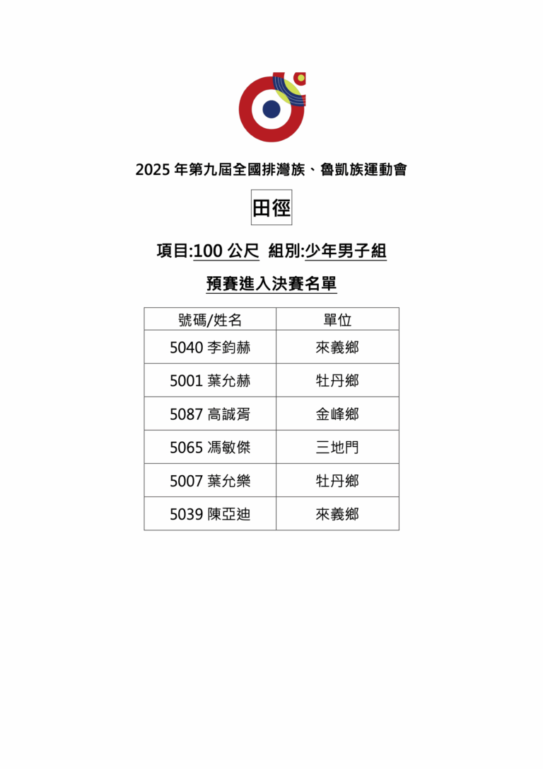 🎉🎉🎉狂賀!排球-壯年男子組(九人制)第一名:瑪家鄉(高文慶、何義勝、葉哲明、邱志文、蔡天明、蔣書懷、簡志強、方正榮、曾永安、林中逵、黃進雄、董志豪、黃彥俊、黃輝雄、郭明義)🎉🎉🎉狂賀!排球-公開男子組(六人制)第一名:瑪家鄉(董聖文、武睿恩、蔡東橙、林翰杰、謝宇杰、何皓維、李駿、施予恩、羅予宸、柳育晨、翁昱誠)🎉🎉🎉狂賀!籃球-公開男子組第一名:牡丹鄉(黃英凱、陳京華、潘念龍、宋富傑、尤承恩、張仲崴、林澔恩、周祐民、洪孝麒、許皓哲、潘昱璋、許昊評、洪懷恩、潘冠綸、黃少玄)🎉🎉🎉狂賀!籃球-壯年男子組第一名:牡丹鄉(白慶漢、林志偉、林克偉、謝志鴻、鄧凱君、潘宣任、林呈賢、陳韋麟、姚弘德、郭博駿、戚光復、陳政文、古啟為、董尚德、陳豪杰)🎉🎉🎉狂賀!排球-公開女子組(六人制)第一名:三地門鄉(高勒斯、柯念慈、古撒楂.思樂、吳瑜潔、王海燕、高恩慈、許瑜落、柯育婷、江思萳、何亮妤、宋湘薰、顏祈蓁)🎉🎉🎉狂賀!田徑-公開混合組【20x100 公尺大隊接力】第一名:牡丹鄉(潘以樂、歐奕廷、高立、杜俊毅、李樂、高晨耀、方致亮、郭大千、林佑杰、何以諾、董薇安、陳詩涵、余欣蕾、王緹、蔡方瑜、余涵、黃凌兒、蔡妤芯、杜禹瑩、鍾晨葳)🎉🎉🎉狂賀!足球(五人制)-少年女子組第一名:來義鄉(卓苡安、高姷安、劉馨妤、呂艾蓁、蘇利莎、高培欣、宗貝樺、王培瑄、林莫、高曉安、蘇艾莎、曹亞柏蘭)🎉🎉🎉狂賀!足球(五人制)-青少年女子組第一名:泰武鄉(田芷嫣、張歆瑜、陳琳、王羽涵、鍾愛、拉法屋斯.道卡都、孫妍晞、邱亮瑜、王喜善、謝巧恩、董暮婗、謝潔恩)🎉🎉🎉狂賀!足球(五人制)-青少年男子組第一名:牡丹鄉(陳杰瑞、潘政杰、陳聖楷、張維丞、謝雨翔、張辰軍、潘元澤、林 肯、高浩安、王胤、胡宇諾、白玉安)🎉🎉🎉狂賀!足球(五人制)-公開男子組第一名:春日鄉(黃杰、洪子貴、李祥偉、黃世恩、林陞、林晨、陳亞靖、林韋揚、陳家祥、蔡振偉、廖雨豪、潘宗皓)🎉🎉🎉狂賀!慢速壘球-公開男子組第一名:牡丹鄉(林承御、李冠年、馬許晧、尤士豪、潘華銨、張皓偉、張皓晨、林識賢、李智揚、陳泰羽、余廣嶺、童緯、古培脩、鐘聖傑、吳家銘、林奕廷、李紹宗、賴志成、黃岑浩、柯毅)🎉🎉🎉狂賀!傳統射箭-公開男女混雙對抗賽第一名:春日鄉(郭美心、呂天明)🎉🎉🎉狂賀!傳統拔河-公開混合組第一名:三地門鄉(鄭孝恆、郭文榮、雷建斌、鄭家豪、楊正豪、何浩銘、捌賽·達里馬烙·捌茲格勒、馮偉成、黃孝祖、蔡世豪、鄭孝榮、楊翔皓、黃孝宗、楊揚、田筱柔、涂陳眞、蔡芳妤、江以璇、董俐伶、全田以法、䝉偉杉、柯祖筠、杜以斯帖、馮玉安)🎉🎉🎉狂賀!羽球-壯年男子雙打第一名:瑪家鄉(洪仁光、簡孝勇)🎉🎉🎉狂賀!足球(五人制)-公開女子組第一名:牡丹鄉(黃鈺婷、黃玉慈、張君涵、鐘欣凌、張舒凱、謝嘉欣、柯璇、謝嘉禎、余亞凡、許師郁、黃宜君)🎉🎉🎉狂賀!田徑-公開男子組【4x400公尺接力】第一名:三地門鄉(明太尊、黃柏豪、邱孝嚴、詹堂貴)🎉🎉🎉狂賀!羽球-長青女子雙打第一名:來義鄉(高淑珍、余英玲)🎉🎉🎉狂賀!田徑-公開女子組【4x400公尺接力】第一名:牡丹鄉(余涵、劉萱、余欣蕾、董薇安)🎉🎉🎉狂賀!傳統射箭-公開男子組【團體對抗賽】第一名:金峰鄉(温少軒、蔡新德、陳璽旨、陳信有)🎉🎉🎉狂賀!傳統射箭-公開女子組【團體對抗賽】第一名:大武鄉(潘如慧、王妤若、潘如萍、谷阿娜 答給帆)🎉🎉🎉狂賀!田徑-公開男子組【三級跳遠】第一名:牡丹鄉(葉吳堉綋)🎉🎉🎉狂賀!足球(五人制)-少年男子組第一名:來義鄉(高丰、魏雋喆、柯柏文、卓尚恩、連霓昊、王維希、魏亮喆、羅允希、陳品叡、孔霆威)🎉🎉🎉狂賀!羽球-長青男子雙打第一名:牡丹鄉(蔡志光、蔡品清)🎉🎉🎉狂賀!桌球-公開團體組第一名:三地門鄉(李慶男、巴士明、陳明光、陳佳佑、陳彌、黃羽彤、黃韞纈、陳佳旋、邱秀妹、江恩羽)🎉🎉🎉狂賀!籃球-公開女子組第一名:牡丹鄉(周思華、劉赫媞、葉吳佳君、華韋恩、張卉卿、張卉庭、李恩屏、張佳茵、李安琪、陳子柔、張辰妍、潘芊芷、簡宇婕、莊婕心、葉吳佳佳)🎉🎉🎉狂賀!田徑-少年女子組【4x200公尺接力】第一名:來義鄉(洪敏恩、柯若婕、田甯、曹楊希)🎉🎉🎉狂賀!傳統射箭-公開女子組【個人對抗賽】第一名:大武鄉(谷阿娜.答給帆)🎉🎉🎉狂賀!羽球-壯年女子雙打第一名:霧臺鄉(鄭佳音、馮玉蘭)🎉🎉🎉狂賀!田徑-公開女子組【跳遠】第一名:達仁鄉(劉朔媛)🎉🎉🎉狂賀!田徑-少年男子組【4x200公尺接力】第一名:三地門鄉(鄭瑾謄、楊大慶、柯偉翔、馮敏傑)🎉🎉🎉狂賀!負重接力-公開混合組第一名:三地門鄉(翁俊洋、邱孝嚴、黃柏豪、明太尊、李柔、陳念家、邱孝諼、潘欣、潘念祖、江思萳)🎉🎉🎉狂賀!田徑-公開男子組【800公尺】第一名:瑪家鄉(簡廷翰)🎉🎉🎉狂賀!田徑-公開女子組【800公尺】第一名:來義鄉(湯婕妤)🎉🎉🎉狂賀!傳統射箭-公開男子組【個人對抗賽】第一名:卑南鄉(李漢儐)🎉🎉🎉狂賀!桌球-公開組女子雙打賽第一名:三地門鄉(黃韞纈、黃羽彤)🎉🎉🎉狂賀!桌球-公開組男子雙打賽第一名:三地門鄉(陳佳佑、陳彌)🎉🎉🎉狂賀!