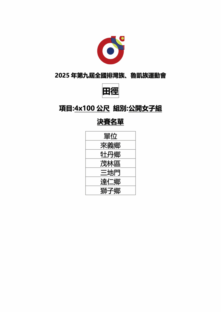 🎉🎉🎉狂賀!排球-壯年男子組(九人制)第一名:瑪家鄉(高文慶、何義勝、葉哲明、邱志文、蔡天明、蔣書懷、簡志強、方正榮、曾永安、林中逵、黃進雄、董志豪、黃彥俊、黃輝雄、郭明義)🎉🎉🎉狂賀!排球-公開男子組(六人制)第一名:瑪家鄉(董聖文、武睿恩、蔡東橙、林翰杰、謝宇杰、何皓維、李駿、施予恩、羅予宸、柳育晨、翁昱誠)🎉🎉🎉狂賀!籃球-公開男子組第一名:牡丹鄉(黃英凱、陳京華、潘念龍、宋富傑、尤承恩、張仲崴、林澔恩、周祐民、洪孝麒、許皓哲、潘昱璋、許昊評、洪懷恩、潘冠綸、黃少玄)🎉🎉🎉狂賀!籃球-壯年男子組第一名:牡丹鄉(白慶漢、林志偉、林克偉、謝志鴻、鄧凱君、潘宣任、林呈賢、陳韋麟、姚弘德、郭博駿、戚光復、陳政文、古啟為、董尚德、陳豪杰)🎉🎉🎉狂賀!排球-公開女子組(六人制)第一名:三地門鄉(高勒斯、柯念慈、古撒楂.思樂、吳瑜潔、王海燕、高恩慈、許瑜落、柯育婷、江思萳、何亮妤、宋湘薰、顏祈蓁)🎉🎉🎉狂賀!田徑-公開混合組【20x100 公尺大隊接力】第一名:牡丹鄉(潘以樂、歐奕廷、高立、杜俊毅、李樂、高晨耀、方致亮、郭大千、林佑杰、何以諾、董薇安、陳詩涵、余欣蕾、王緹、蔡方瑜、余涵、黃凌兒、蔡妤芯、杜禹瑩、鍾晨葳)🎉🎉🎉狂賀!足球(五人制)-少年女子組第一名:來義鄉(卓苡安、高姷安、劉馨妤、呂艾蓁、蘇利莎、高培欣、宗貝樺、王培瑄、林莫、高曉安、蘇艾莎、曹亞柏蘭)🎉🎉🎉狂賀!足球(五人制)-青少年女子組第一名:泰武鄉(田芷嫣、張歆瑜、陳琳、王羽涵、鍾愛、拉法屋斯.道卡都、孫妍晞、邱亮瑜、王喜善、謝巧恩、董暮婗、謝潔恩)🎉🎉🎉狂賀!足球(五人制)-青少年男子組第一名:牡丹鄉(陳杰瑞、潘政杰、陳聖楷、張維丞、謝雨翔、張辰軍、潘元澤、林 肯、高浩安、王胤、胡宇諾、白玉安)🎉🎉🎉狂賀!足球(五人制)-公開男子組第一名:春日鄉(黃杰、洪子貴、李祥偉、黃世恩、林陞、林晨、陳亞靖、林韋揚、陳家祥、蔡振偉、廖雨豪、潘宗皓)🎉🎉🎉狂賀!慢速壘球-公開男子組第一名:牡丹鄉(林承御、李冠年、馬許晧、尤士豪、潘華銨、張皓偉、張皓晨、林識賢、李智揚、陳泰羽、余廣嶺、童緯、古培脩、鐘聖傑、吳家銘、林奕廷、李紹宗、賴志成、黃岑浩、柯毅)🎉🎉🎉狂賀!傳統射箭-公開男女混雙對抗賽第一名:春日鄉(郭美心、呂天明)🎉🎉🎉狂賀!傳統拔河-公開混合組第一名:三地門鄉(鄭孝恆、郭文榮、雷建斌、鄭家豪、楊正豪、何浩銘、捌賽·達里馬烙·捌茲格勒、馮偉成、黃孝祖、蔡世豪、鄭孝榮、楊翔皓、黃孝宗、楊揚、田筱柔、涂陳眞、蔡芳妤、江以璇、董俐伶、全田以法、䝉偉杉、柯祖筠、杜以斯帖、馮玉安)🎉🎉🎉狂賀!羽球-壯年男子雙打第一名:瑪家鄉(洪仁光、簡孝勇)🎉🎉🎉狂賀!足球(五人制)-公開女子組第一名:牡丹鄉(黃鈺婷、黃玉慈、張君涵、鐘欣凌、張舒凱、謝嘉欣、柯璇、謝嘉禎、余亞凡、許師郁、黃宜君)🎉🎉🎉狂賀!田徑-公開男子組【4x400公尺接力】第一名:三地門鄉(明太尊、黃柏豪、邱孝嚴、詹堂貴)🎉🎉🎉狂賀!羽球-長青女子雙打第一名:來義鄉(高淑珍、余英玲)🎉🎉🎉狂賀!田徑-公開女子組【4x400公尺接力】第一名:牡丹鄉(余涵、劉萱、余欣蕾、董薇安)🎉🎉🎉狂賀!傳統射箭-公開男子組【團體對抗賽】第一名:金峰鄉(温少軒、蔡新德、陳璽旨、陳信有)🎉🎉🎉狂賀!傳統射箭-公開女子組【團體對抗賽】第一名:大武鄉(潘如慧、王妤若、潘如萍、谷阿娜 答給帆)🎉🎉🎉狂賀!田徑-公開男子組【三級跳遠】第一名:牡丹鄉(葉吳堉綋)🎉🎉🎉狂賀!足球(五人制)-少年男子組第一名:來義鄉(高丰、魏雋喆、柯柏文、卓尚恩、連霓昊、王維希、魏亮喆、羅允希、陳品叡、孔霆威)🎉🎉🎉狂賀!羽球-長青男子雙打第一名:牡丹鄉(蔡志光、蔡品清)🎉🎉🎉狂賀!桌球-公開團體組第一名:三地門鄉(李慶男、巴士明、陳明光、陳佳佑、陳彌、黃羽彤、黃韞纈、陳佳旋、邱秀妹、江恩羽)🎉🎉🎉狂賀!籃球-公開女子組第一名:牡丹鄉(周思華、劉赫媞、葉吳佳君、華韋恩、張卉卿、張卉庭、李恩屏、張佳茵、李安琪、陳子柔、張辰妍、潘芊芷、簡宇婕、莊婕心、葉吳佳佳)🎉🎉🎉狂賀!田徑-少年女子組【4x200公尺接力】第一名:來義鄉(洪敏恩、柯若婕、田甯、曹楊希)🎉🎉🎉狂賀!傳統射箭-公開女子組【個人對抗賽】第一名:大武鄉(谷阿娜.答給帆)🎉🎉🎉狂賀!羽球-壯年女子雙打第一名:霧臺鄉(鄭佳音、馮玉蘭)🎉🎉🎉狂賀!田徑-公開女子組【跳遠】第一名:達仁鄉(劉朔媛)🎉🎉🎉狂賀!田徑-少年男子組【4x200公尺接力】第一名:三地門鄉(鄭瑾謄、楊大慶、柯偉翔、馮敏傑)🎉🎉🎉狂賀!負重接力-公開混合組第一名:三地門鄉(翁俊洋、邱孝嚴、黃柏豪、明太尊、李柔、陳念家、邱孝諼、潘欣、潘念祖、江思萳)🎉🎉🎉狂賀!田徑-公開男子組【800公尺】第一名:瑪家鄉(簡廷翰)🎉🎉🎉狂賀!田徑-公開女子組【800公尺】第一名:來義鄉(湯婕妤)🎉🎉🎉狂賀!傳統射箭-公開男子組【個人對抗賽】第一名:卑南鄉(李漢儐)🎉🎉🎉狂賀!桌球-公開組女子雙打賽第一名:三地門鄉(黃韞纈、黃羽彤)🎉🎉🎉狂賀!桌球-公開組男子雙打賽第一名:三地門鄉(陳佳佑、陳彌)🎉🎉🎉狂賀!