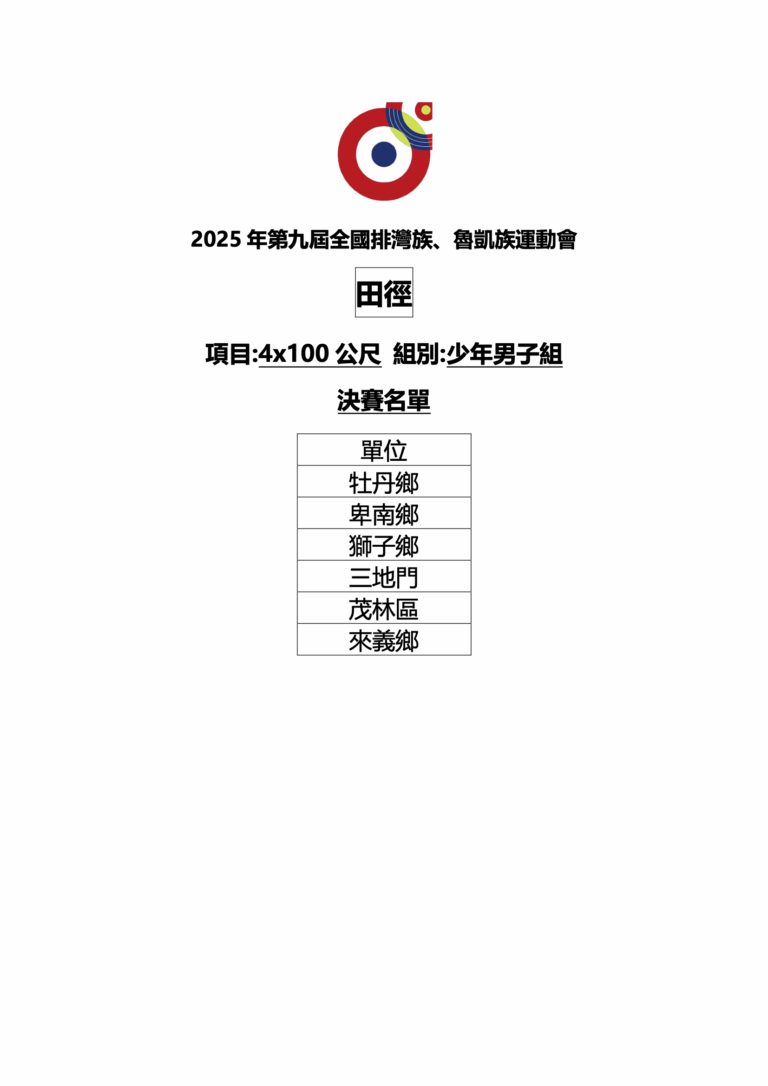 🎉🎉🎉狂賀!排球-壯年男子組(九人制)第一名:瑪家鄉(高文慶、何義勝、葉哲明、邱志文、蔡天明、蔣書懷、簡志強、方正榮、曾永安、林中逵、黃進雄、董志豪、黃彥俊、黃輝雄、郭明義)🎉🎉🎉狂賀!排球-公開男子組(六人制)第一名:瑪家鄉(董聖文、武睿恩、蔡東橙、林翰杰、謝宇杰、何皓維、李駿、施予恩、羅予宸、柳育晨、翁昱誠)🎉🎉🎉狂賀!籃球-公開男子組第一名:牡丹鄉(黃英凱、陳京華、潘念龍、宋富傑、尤承恩、張仲崴、林澔恩、周祐民、洪孝麒、許皓哲、潘昱璋、許昊評、洪懷恩、潘冠綸、黃少玄)🎉🎉🎉狂賀!籃球-壯年男子組第一名:牡丹鄉(白慶漢、林志偉、林克偉、謝志鴻、鄧凱君、潘宣任、林呈賢、陳韋麟、姚弘德、郭博駿、戚光復、陳政文、古啟為、董尚德、陳豪杰)🎉🎉🎉狂賀!排球-公開女子組(六人制)第一名:三地門鄉(高勒斯、柯念慈、古撒楂.思樂、吳瑜潔、王海燕、高恩慈、許瑜落、柯育婷、江思萳、何亮妤、宋湘薰、顏祈蓁)🎉🎉🎉狂賀!田徑-公開混合組【20x100 公尺大隊接力】第一名:牡丹鄉(潘以樂、歐奕廷、高立、杜俊毅、李樂、高晨耀、方致亮、郭大千、林佑杰、何以諾、董薇安、陳詩涵、余欣蕾、王緹、蔡方瑜、余涵、黃凌兒、蔡妤芯、杜禹瑩、鍾晨葳)🎉🎉🎉狂賀!足球(五人制)-少年女子組第一名:來義鄉(卓苡安、高姷安、劉馨妤、呂艾蓁、蘇利莎、高培欣、宗貝樺、王培瑄、林莫、高曉安、蘇艾莎、曹亞柏蘭)🎉🎉🎉狂賀!足球(五人制)-青少年女子組第一名:泰武鄉(田芷嫣、張歆瑜、陳琳、王羽涵、鍾愛、拉法屋斯.道卡都、孫妍晞、邱亮瑜、王喜善、謝巧恩、董暮婗、謝潔恩)🎉🎉🎉狂賀!足球(五人制)-青少年男子組第一名:牡丹鄉(陳杰瑞、潘政杰、陳聖楷、張維丞、謝雨翔、張辰軍、潘元澤、林 肯、高浩安、王胤、胡宇諾、白玉安)🎉🎉🎉狂賀!足球(五人制)-公開男子組第一名:春日鄉(黃杰、洪子貴、李祥偉、黃世恩、林陞、林晨、陳亞靖、林韋揚、陳家祥、蔡振偉、廖雨豪、潘宗皓)🎉🎉🎉狂賀!慢速壘球-公開男子組第一名:牡丹鄉(林承御、李冠年、馬許晧、尤士豪、潘華銨、張皓偉、張皓晨、林識賢、李智揚、陳泰羽、余廣嶺、童緯、古培脩、鐘聖傑、吳家銘、林奕廷、李紹宗、賴志成、黃岑浩、柯毅)🎉🎉🎉狂賀!傳統射箭-公開男女混雙對抗賽第一名:春日鄉(郭美心、呂天明)🎉🎉🎉狂賀!傳統拔河-公開混合組第一名:三地門鄉(鄭孝恆、郭文榮、雷建斌、鄭家豪、楊正豪、何浩銘、捌賽·達里馬烙·捌茲格勒、馮偉成、黃孝祖、蔡世豪、鄭孝榮、楊翔皓、黃孝宗、楊揚、田筱柔、涂陳眞、蔡芳妤、江以璇、董俐伶、全田以法、䝉偉杉、柯祖筠、杜以斯帖、馮玉安)🎉🎉🎉狂賀!羽球-壯年男子雙打第一名:瑪家鄉(洪仁光、簡孝勇)🎉🎉🎉狂賀!足球(五人制)-公開女子組第一名:牡丹鄉(黃鈺婷、黃玉慈、張君涵、鐘欣凌、張舒凱、謝嘉欣、柯璇、謝嘉禎、余亞凡、許師郁、黃宜君)🎉🎉🎉狂賀!田徑-公開男子組【4x400公尺接力】第一名:三地門鄉(明太尊、黃柏豪、邱孝嚴、詹堂貴)🎉🎉🎉狂賀!羽球-長青女子雙打第一名:來義鄉(高淑珍、余英玲)🎉🎉🎉狂賀!田徑-公開女子組【4x400公尺接力】第一名:牡丹鄉(余涵、劉萱、余欣蕾、董薇安)🎉🎉🎉狂賀!傳統射箭-公開男子組【團體對抗賽】第一名:金峰鄉(温少軒、蔡新德、陳璽旨、陳信有)🎉🎉🎉狂賀!傳統射箭-公開女子組【團體對抗賽】第一名:大武鄉(潘如慧、王妤若、潘如萍、谷阿娜 答給帆)🎉🎉🎉狂賀!田徑-公開男子組【三級跳遠】第一名:牡丹鄉(葉吳堉綋)🎉🎉🎉狂賀!足球(五人制)-少年男子組第一名:來義鄉(高丰、魏雋喆、柯柏文、卓尚恩、連霓昊、王維希、魏亮喆、羅允希、陳品叡、孔霆威)🎉🎉🎉狂賀!羽球-長青男子雙打第一名:牡丹鄉(蔡志光、蔡品清)🎉🎉🎉狂賀!桌球-公開團體組第一名:三地門鄉(李慶男、巴士明、陳明光、陳佳佑、陳彌、黃羽彤、黃韞纈、陳佳旋、邱秀妹、江恩羽)🎉🎉🎉狂賀!籃球-公開女子組第一名:牡丹鄉(周思華、劉赫媞、葉吳佳君、華韋恩、張卉卿、張卉庭、李恩屏、張佳茵、李安琪、陳子柔、張辰妍、潘芊芷、簡宇婕、莊婕心、葉吳佳佳)🎉🎉🎉狂賀!田徑-少年女子組【4x200公尺接力】第一名:來義鄉(洪敏恩、柯若婕、田甯、曹楊希)🎉🎉🎉狂賀!傳統射箭-公開女子組【個人對抗賽】第一名:大武鄉(谷阿娜.答給帆)🎉🎉🎉狂賀!羽球-壯年女子雙打第一名:霧臺鄉(鄭佳音、馮玉蘭)🎉🎉🎉狂賀!田徑-公開女子組【跳遠】第一名:達仁鄉(劉朔媛)🎉🎉🎉狂賀!田徑-少年男子組【4x200公尺接力】第一名:三地門鄉(鄭瑾謄、楊大慶、柯偉翔、馮敏傑)🎉🎉🎉狂賀!負重接力-公開混合組第一名:三地門鄉(翁俊洋、邱孝嚴、黃柏豪、明太尊、李柔、陳念家、邱孝諼、潘欣、潘念祖、江思萳)🎉🎉🎉狂賀!田徑-公開男子組【800公尺】第一名:瑪家鄉(簡廷翰)🎉🎉🎉狂賀!田徑-公開女子組【800公尺】第一名:來義鄉(湯婕妤)🎉🎉🎉狂賀!傳統射箭-公開男子組【個人對抗賽】第一名:卑南鄉(李漢儐)🎉🎉🎉狂賀!桌球-公開組女子雙打賽第一名:三地門鄉(黃韞纈、黃羽彤)🎉🎉🎉狂賀!桌球-公開組男子雙打賽第一名:三地門鄉(陳佳佑、陳彌)🎉🎉🎉狂賀!