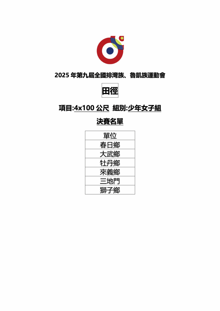 🎉🎉🎉狂賀!排球-壯年男子組(九人制)第一名:瑪家鄉(高文慶、何義勝、葉哲明、邱志文、蔡天明、蔣書懷、簡志強、方正榮、曾永安、林中逵、黃進雄、董志豪、黃彥俊、黃輝雄、郭明義)🎉🎉🎉狂賀!排球-公開男子組(六人制)第一名:瑪家鄉(董聖文、武睿恩、蔡東橙、林翰杰、謝宇杰、何皓維、李駿、施予恩、羅予宸、柳育晨、翁昱誠)🎉🎉🎉狂賀!籃球-公開男子組第一名:牡丹鄉(黃英凱、陳京華、潘念龍、宋富傑、尤承恩、張仲崴、林澔恩、周祐民、洪孝麒、許皓哲、潘昱璋、許昊評、洪懷恩、潘冠綸、黃少玄)🎉🎉🎉狂賀!籃球-壯年男子組第一名:牡丹鄉(白慶漢、林志偉、林克偉、謝志鴻、鄧凱君、潘宣任、林呈賢、陳韋麟、姚弘德、郭博駿、戚光復、陳政文、古啟為、董尚德、陳豪杰)🎉🎉🎉狂賀!排球-公開女子組(六人制)第一名:三地門鄉(高勒斯、柯念慈、古撒楂.思樂、吳瑜潔、王海燕、高恩慈、許瑜落、柯育婷、江思萳、何亮妤、宋湘薰、顏祈蓁)🎉🎉🎉狂賀!田徑-公開混合組【20x100 公尺大隊接力】第一名:牡丹鄉(潘以樂、歐奕廷、高立、杜俊毅、李樂、高晨耀、方致亮、郭大千、林佑杰、何以諾、董薇安、陳詩涵、余欣蕾、王緹、蔡方瑜、余涵、黃凌兒、蔡妤芯、杜禹瑩、鍾晨葳)🎉🎉🎉狂賀!足球(五人制)-少年女子組第一名:來義鄉(卓苡安、高姷安、劉馨妤、呂艾蓁、蘇利莎、高培欣、宗貝樺、王培瑄、林莫、高曉安、蘇艾莎、曹亞柏蘭)🎉🎉🎉狂賀!足球(五人制)-青少年女子組第一名:泰武鄉(田芷嫣、張歆瑜、陳琳、王羽涵、鍾愛、拉法屋斯.道卡都、孫妍晞、邱亮瑜、王喜善、謝巧恩、董暮婗、謝潔恩)🎉🎉🎉狂賀!足球(五人制)-青少年男子組第一名:牡丹鄉(陳杰瑞、潘政杰、陳聖楷、張維丞、謝雨翔、張辰軍、潘元澤、林 肯、高浩安、王胤、胡宇諾、白玉安)🎉🎉🎉狂賀!足球(五人制)-公開男子組第一名:春日鄉(黃杰、洪子貴、李祥偉、黃世恩、林陞、林晨、陳亞靖、林韋揚、陳家祥、蔡振偉、廖雨豪、潘宗皓)🎉🎉🎉狂賀!慢速壘球-公開男子組第一名:牡丹鄉(林承御、李冠年、馬許晧、尤士豪、潘華銨、張皓偉、張皓晨、林識賢、李智揚、陳泰羽、余廣嶺、童緯、古培脩、鐘聖傑、吳家銘、林奕廷、李紹宗、賴志成、黃岑浩、柯毅)🎉🎉🎉狂賀!傳統射箭-公開男女混雙對抗賽第一名:春日鄉(郭美心、呂天明)🎉🎉🎉狂賀!傳統拔河-公開混合組第一名:三地門鄉(鄭孝恆、郭文榮、雷建斌、鄭家豪、楊正豪、何浩銘、捌賽·達里馬烙·捌茲格勒、馮偉成、黃孝祖、蔡世豪、鄭孝榮、楊翔皓、黃孝宗、楊揚、田筱柔、涂陳眞、蔡芳妤、江以璇、董俐伶、全田以法、䝉偉杉、柯祖筠、杜以斯帖、馮玉安)🎉🎉🎉狂賀!羽球-壯年男子雙打第一名:瑪家鄉(洪仁光、簡孝勇)🎉🎉🎉狂賀!足球(五人制)-公開女子組第一名:牡丹鄉(黃鈺婷、黃玉慈、張君涵、鐘欣凌、張舒凱、謝嘉欣、柯璇、謝嘉禎、余亞凡、許師郁、黃宜君)🎉🎉🎉狂賀!田徑-公開男子組【4x400公尺接力】第一名:三地門鄉(明太尊、黃柏豪、邱孝嚴、詹堂貴)🎉🎉🎉狂賀!羽球-長青女子雙打第一名:來義鄉(高淑珍、余英玲)🎉🎉🎉狂賀!田徑-公開女子組【4x400公尺接力】第一名:牡丹鄉(余涵、劉萱、余欣蕾、董薇安)🎉🎉🎉狂賀!傳統射箭-公開男子組【團體對抗賽】第一名:金峰鄉(温少軒、蔡新德、陳璽旨、陳信有)🎉🎉🎉狂賀!傳統射箭-公開女子組【團體對抗賽】第一名:大武鄉(潘如慧、王妤若、潘如萍、谷阿娜 答給帆)🎉🎉🎉狂賀!田徑-公開男子組【三級跳遠】第一名:牡丹鄉(葉吳堉綋)🎉🎉🎉狂賀!足球(五人制)-少年男子組第一名:來義鄉(高丰、魏雋喆、柯柏文、卓尚恩、連霓昊、王維希、魏亮喆、羅允希、陳品叡、孔霆威)🎉🎉🎉狂賀!羽球-長青男子雙打第一名:牡丹鄉(蔡志光、蔡品清)🎉🎉🎉狂賀!桌球-公開團體組第一名:三地門鄉(李慶男、巴士明、陳明光、陳佳佑、陳彌、黃羽彤、黃韞纈、陳佳旋、邱秀妹、江恩羽)🎉🎉🎉狂賀!籃球-公開女子組第一名:牡丹鄉(周思華、劉赫媞、葉吳佳君、華韋恩、張卉卿、張卉庭、李恩屏、張佳茵、李安琪、陳子柔、張辰妍、潘芊芷、簡宇婕、莊婕心、葉吳佳佳)🎉🎉🎉狂賀!田徑-少年女子組【4x200公尺接力】第一名:來義鄉(洪敏恩、柯若婕、田甯、曹楊希)🎉🎉🎉狂賀!傳統射箭-公開女子組【個人對抗賽】第一名:大武鄉(谷阿娜.答給帆)🎉🎉🎉狂賀!羽球-壯年女子雙打第一名:霧臺鄉(鄭佳音、馮玉蘭)🎉🎉🎉狂賀!田徑-公開女子組【跳遠】第一名:達仁鄉(劉朔媛)🎉🎉🎉狂賀!田徑-少年男子組【4x200公尺接力】第一名:三地門鄉(鄭瑾謄、楊大慶、柯偉翔、馮敏傑)🎉🎉🎉狂賀!負重接力-公開混合組第一名:三地門鄉(翁俊洋、邱孝嚴、黃柏豪、明太尊、李柔、陳念家、邱孝諼、潘欣、潘念祖、江思萳)🎉🎉🎉狂賀!田徑-公開男子組【800公尺】第一名:瑪家鄉(簡廷翰)🎉🎉🎉狂賀!田徑-公開女子組【800公尺】第一名:來義鄉(湯婕妤)🎉🎉🎉狂賀!傳統射箭-公開男子組【個人對抗賽】第一名:卑南鄉(李漢儐)🎉🎉🎉狂賀!桌球-公開組女子雙打賽第一名:三地門鄉(黃韞纈、黃羽彤)🎉🎉🎉狂賀!桌球-公開組男子雙打賽第一名:三地門鄉(陳佳佑、陳彌)🎉🎉🎉狂賀!