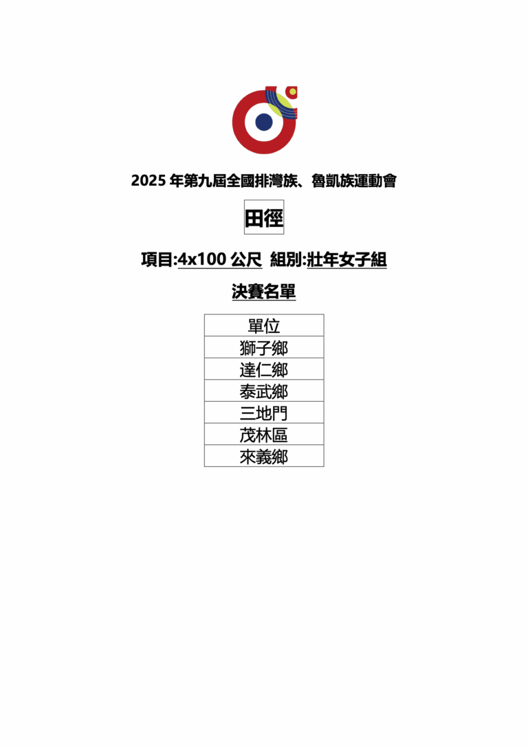 🎉🎉🎉狂賀!排球-壯年男子組(九人制)第一名:瑪家鄉(高文慶、何義勝、葉哲明、邱志文、蔡天明、蔣書懷、簡志強、方正榮、曾永安、林中逵、黃進雄、董志豪、黃彥俊、黃輝雄、郭明義)🎉🎉🎉狂賀!排球-公開男子組(六人制)第一名:瑪家鄉(董聖文、武睿恩、蔡東橙、林翰杰、謝宇杰、何皓維、李駿、施予恩、羅予宸、柳育晨、翁昱誠)🎉🎉🎉狂賀!籃球-公開男子組第一名:牡丹鄉(黃英凱、陳京華、潘念龍、宋富傑、尤承恩、張仲崴、林澔恩、周祐民、洪孝麒、許皓哲、潘昱璋、許昊評、洪懷恩、潘冠綸、黃少玄)🎉🎉🎉狂賀!籃球-壯年男子組第一名:牡丹鄉(白慶漢、林志偉、林克偉、謝志鴻、鄧凱君、潘宣任、林呈賢、陳韋麟、姚弘德、郭博駿、戚光復、陳政文、古啟為、董尚德、陳豪杰)🎉🎉🎉狂賀!排球-公開女子組(六人制)第一名:三地門鄉(高勒斯、柯念慈、古撒楂.思樂、吳瑜潔、王海燕、高恩慈、許瑜落、柯育婷、江思萳、何亮妤、宋湘薰、顏祈蓁)🎉🎉🎉狂賀!田徑-公開混合組【20x100 公尺大隊接力】第一名:牡丹鄉(潘以樂、歐奕廷、高立、杜俊毅、李樂、高晨耀、方致亮、郭大千、林佑杰、何以諾、董薇安、陳詩涵、余欣蕾、王緹、蔡方瑜、余涵、黃凌兒、蔡妤芯、杜禹瑩、鍾晨葳)🎉🎉🎉狂賀!足球(五人制)-少年女子組第一名:來義鄉(卓苡安、高姷安、劉馨妤、呂艾蓁、蘇利莎、高培欣、宗貝樺、王培瑄、林莫、高曉安、蘇艾莎、曹亞柏蘭)🎉🎉🎉狂賀!足球(五人制)-青少年女子組第一名:泰武鄉(田芷嫣、張歆瑜、陳琳、王羽涵、鍾愛、拉法屋斯.道卡都、孫妍晞、邱亮瑜、王喜善、謝巧恩、董暮婗、謝潔恩)🎉🎉🎉狂賀!足球(五人制)-青少年男子組第一名:牡丹鄉(陳杰瑞、潘政杰、陳聖楷、張維丞、謝雨翔、張辰軍、潘元澤、林 肯、高浩安、王胤、胡宇諾、白玉安)🎉🎉🎉狂賀!足球(五人制)-公開男子組第一名:春日鄉(黃杰、洪子貴、李祥偉、黃世恩、林陞、林晨、陳亞靖、林韋揚、陳家祥、蔡振偉、廖雨豪、潘宗皓)🎉🎉🎉狂賀!慢速壘球-公開男子組第一名:牡丹鄉(林承御、李冠年、馬許晧、尤士豪、潘華銨、張皓偉、張皓晨、林識賢、李智揚、陳泰羽、余廣嶺、童緯、古培脩、鐘聖傑、吳家銘、林奕廷、李紹宗、賴志成、黃岑浩、柯毅)🎉🎉🎉狂賀!傳統射箭-公開男女混雙對抗賽第一名:春日鄉(郭美心、呂天明)🎉🎉🎉狂賀!傳統拔河-公開混合組第一名:三地門鄉(鄭孝恆、郭文榮、雷建斌、鄭家豪、楊正豪、何浩銘、捌賽·達里馬烙·捌茲格勒、馮偉成、黃孝祖、蔡世豪、鄭孝榮、楊翔皓、黃孝宗、楊揚、田筱柔、涂陳眞、蔡芳妤、江以璇、董俐伶、全田以法、䝉偉杉、柯祖筠、杜以斯帖、馮玉安)🎉🎉🎉狂賀!羽球-壯年男子雙打第一名:瑪家鄉(洪仁光、簡孝勇)🎉🎉🎉狂賀!足球(五人制)-公開女子組第一名:牡丹鄉(黃鈺婷、黃玉慈、張君涵、鐘欣凌、張舒凱、謝嘉欣、柯璇、謝嘉禎、余亞凡、許師郁、黃宜君)🎉🎉🎉狂賀!田徑-公開男子組【4x400公尺接力】第一名:三地門鄉(明太尊、黃柏豪、邱孝嚴、詹堂貴)🎉🎉🎉狂賀!羽球-長青女子雙打第一名:來義鄉(高淑珍、余英玲)🎉🎉🎉狂賀!田徑-公開女子組【4x400公尺接力】第一名:牡丹鄉(余涵、劉萱、余欣蕾、董薇安)🎉🎉🎉狂賀!傳統射箭-公開男子組【團體對抗賽】第一名:金峰鄉(温少軒、蔡新德、陳璽旨、陳信有)🎉🎉🎉狂賀!傳統射箭-公開女子組【團體對抗賽】第一名:大武鄉(潘如慧、王妤若、潘如萍、谷阿娜 答給帆)🎉🎉🎉狂賀!田徑-公開男子組【三級跳遠】第一名:牡丹鄉(葉吳堉綋)🎉🎉🎉狂賀!足球(五人制)-少年男子組第一名:來義鄉(高丰、魏雋喆、柯柏文、卓尚恩、連霓昊、王維希、魏亮喆、羅允希、陳品叡、孔霆威)🎉🎉🎉狂賀!羽球-長青男子雙打第一名:牡丹鄉(蔡志光、蔡品清)🎉🎉🎉狂賀!桌球-公開團體組第一名:三地門鄉(李慶男、巴士明、陳明光、陳佳佑、陳彌、黃羽彤、黃韞纈、陳佳旋、邱秀妹、江恩羽)🎉🎉🎉狂賀!籃球-公開女子組第一名:牡丹鄉(周思華、劉赫媞、葉吳佳君、華韋恩、張卉卿、張卉庭、李恩屏、張佳茵、李安琪、陳子柔、張辰妍、潘芊芷、簡宇婕、莊婕心、葉吳佳佳)🎉🎉🎉狂賀!田徑-少年女子組【4x200公尺接力】第一名:來義鄉(洪敏恩、柯若婕、田甯、曹楊希)🎉🎉🎉狂賀!傳統射箭-公開女子組【個人對抗賽】第一名:大武鄉(谷阿娜.答給帆)🎉🎉🎉狂賀!羽球-壯年女子雙打第一名:霧臺鄉(鄭佳音、馮玉蘭)🎉🎉🎉狂賀!田徑-公開女子組【跳遠】第一名:達仁鄉(劉朔媛)🎉🎉🎉狂賀!田徑-少年男子組【4x200公尺接力】第一名:三地門鄉(鄭瑾謄、楊大慶、柯偉翔、馮敏傑)🎉🎉🎉狂賀!負重接力-公開混合組第一名:三地門鄉(翁俊洋、邱孝嚴、黃柏豪、明太尊、李柔、陳念家、邱孝諼、潘欣、潘念祖、江思萳)🎉🎉🎉狂賀!田徑-公開男子組【800公尺】第一名:瑪家鄉(簡廷翰)🎉🎉🎉狂賀!田徑-公開女子組【800公尺】第一名:來義鄉(湯婕妤)🎉🎉🎉狂賀!傳統射箭-公開男子組【個人對抗賽】第一名:卑南鄉(李漢儐)🎉🎉🎉狂賀!桌球-公開組女子雙打賽第一名:三地門鄉(黃韞纈、黃羽彤)🎉🎉🎉狂賀!桌球-公開組男子雙打賽第一名:三地門鄉(陳佳佑、陳彌)🎉🎉🎉狂賀!