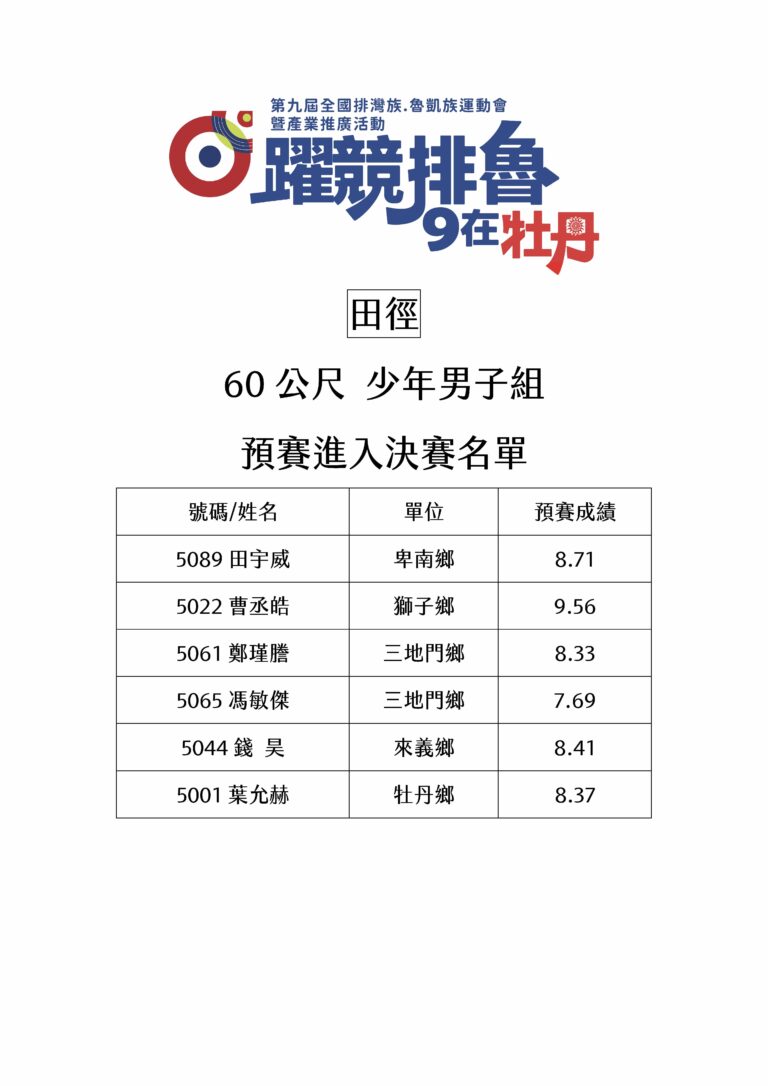 田徑 60公尺 少年男子組 預賽進入決賽名單